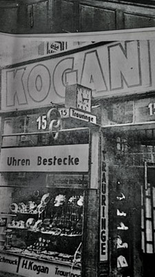 Die jüdische Familie KOGAN stammte „aus dem Osten“. Ihre drei Töchter wurden in Kassel geboren. Die Älteste, Elfriede, am 2.6.1921 geboren, starb mit nur 13 Jahren am 1.7. 1934. Edith Lotte, geboren am 30.6.1922, und Ilse geboren am 28.11.1924, lebten bei ihren Eltern über dem Ladengeschäft in der damaligen Bahnhofstr. 14 in lange Zeit wohlhabenden Verhältnissen.