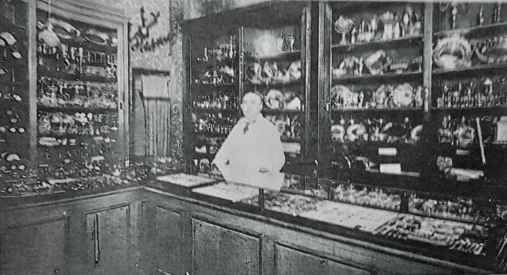 Hermann Kogan in seinem Geschäft - Schaufenster des Geschäfts an der damaligen Bahnhofstraße 14