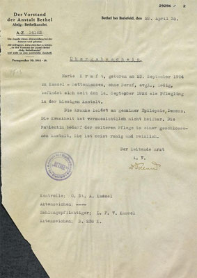 Seit ihrer Geburt litt Marie Kraft an Epilepsie, der sogenannten Fallsucht. Im jugendlichen Alter wurde sie von ihren Eltern in der Wohnung im Haus Agathofstraße 28 betreut. Mit dem Erreichen der Volljährigkeit und zunehmender Demenz erfolgte am 14.09.1926 der „Umzug“ in die „V. Bodelschwinghsche Anstalt“ in Bethel. Dies geschah, nach meinen Kenntnissen, ohne die Zustimmung eines Vormundes oder eines bestellten Betreuers. Die Unterbringung hessischer Epilepsiepatienten in dieser Anstalt in der Nähe von Bielefeld war seit dem 31.07.1893 vertraglich geregelt. Die anfallenden Pflegekosten übernahm damals die Provinz Hessen-Nassau. In Bielefeld verhielt sich Marie Kraft unauffällig und wurde in dem Entlassungsbericht vom 29. April 1938 als „meist ruhig und reinlich“ benannt.
