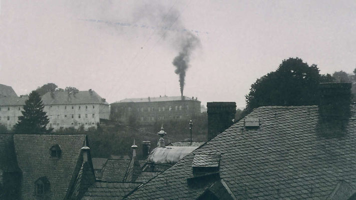 Ein grauer Bus - Rauchfahne des Krematoriums über Hadanar