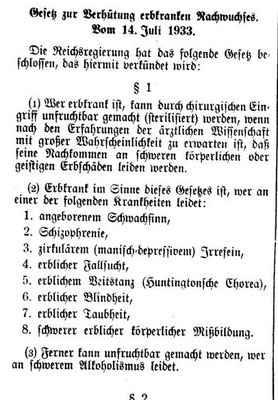 Mit den „Nürnberger Rassengesetzen“, dem „Reichsbürgergesetz“ und dem „Gesetz zum Schutze des deutschen Blutes“ vom 15. September 1935 hatten die Nationalsozialisten die gesetzliche Grundlage zur Diskriminierung ausgedehnter Bevölkerungskreise geschaffen. Mit dem „Gesetz zur Erbgesundheit des Deutschen Volkes“ vom 18. Oktober 1935 wurden auch chronisch Erkrankte in den Kreis der Stigmatisierten einbezogen.