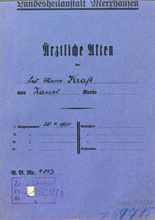 Marie Kraft verließ laut Übergabeschein vom 29.04.1938 die „V. Bodelschwinghsche Anstalt“ in Bethel und wurde ab dem 30.04.1938 in der Landesheilanstalt Merxhausen (heute OT von Bad Emstal) untergebracht. Im selben Transport kamen weitere 30 Frauen aus der Anstalt in Bethel nach Merxhausen.